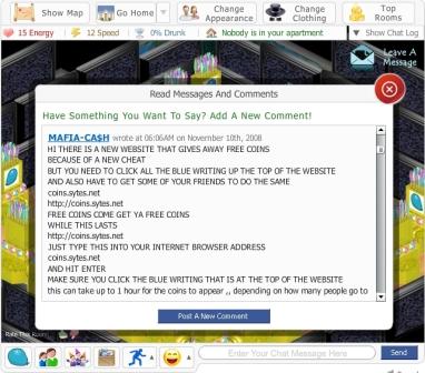 Supposedly, MAFIA-LDR-CHRIS and MAFIA CA$H are the same person, having multiple accounts. Screenshot 1 shows the apartment of someone named “chris_________”. He happens to be on my buddy list. About 4 months ago or so, I ended up at his apartment. He was claiming to be “YoVille’s richest man”. At that time he was offering accounts for $5 dollars. In his message box, he had all the details about it. Pay $5 dollars, and you’d have an account with unlimited speed and energy and 1 million coins. I didn’t’ take the time to report it to YoVille.