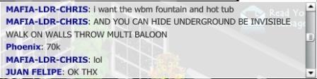 Screenshot 3: An event selling WBM, fountain, hot tubs, and other collectibles was set up. MAFIA-LDR-CHRIS showed up wanting everything. You can see that he says by mistake “AND YOU CAN HIDE UNDERGROUND BE INVISIBLE……”. I assume he had forgotten to turn off his auto-typer and the lines showed up. Obviously this shows he’s one of the ones advertising the ‘coin websites’.